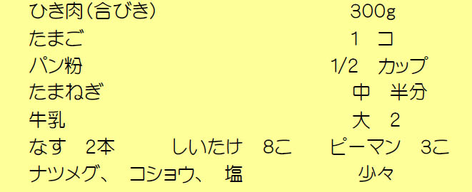 たまねぎは、みじん切りにして、油少々で、良くいためます。ボールに移し、荒熱が取れてから、ひき肉、パン粉、たまご、牛乳を入れよく混ぜます。ナツメグ、塩、コショウを入れ、粘りが出るまで良く混ぜましょう。