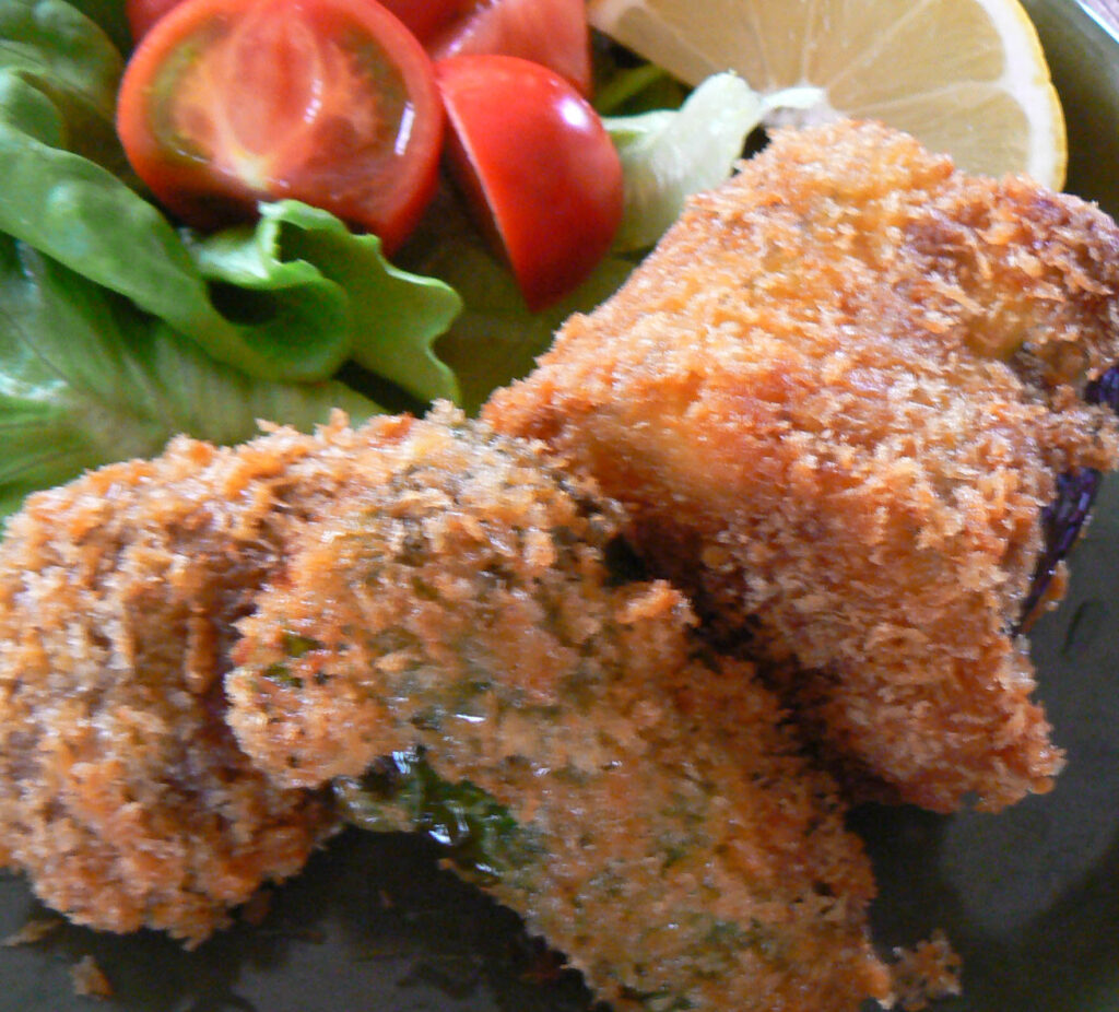 ひき肉をつめて、小麦粉、溶きたまご、パン粉の順に衣をつけます。揚げ油を、180度に熱し、揚げます。